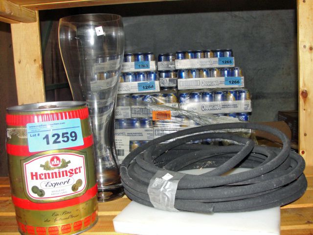 Collectors beer tin, large glass, black hose and a