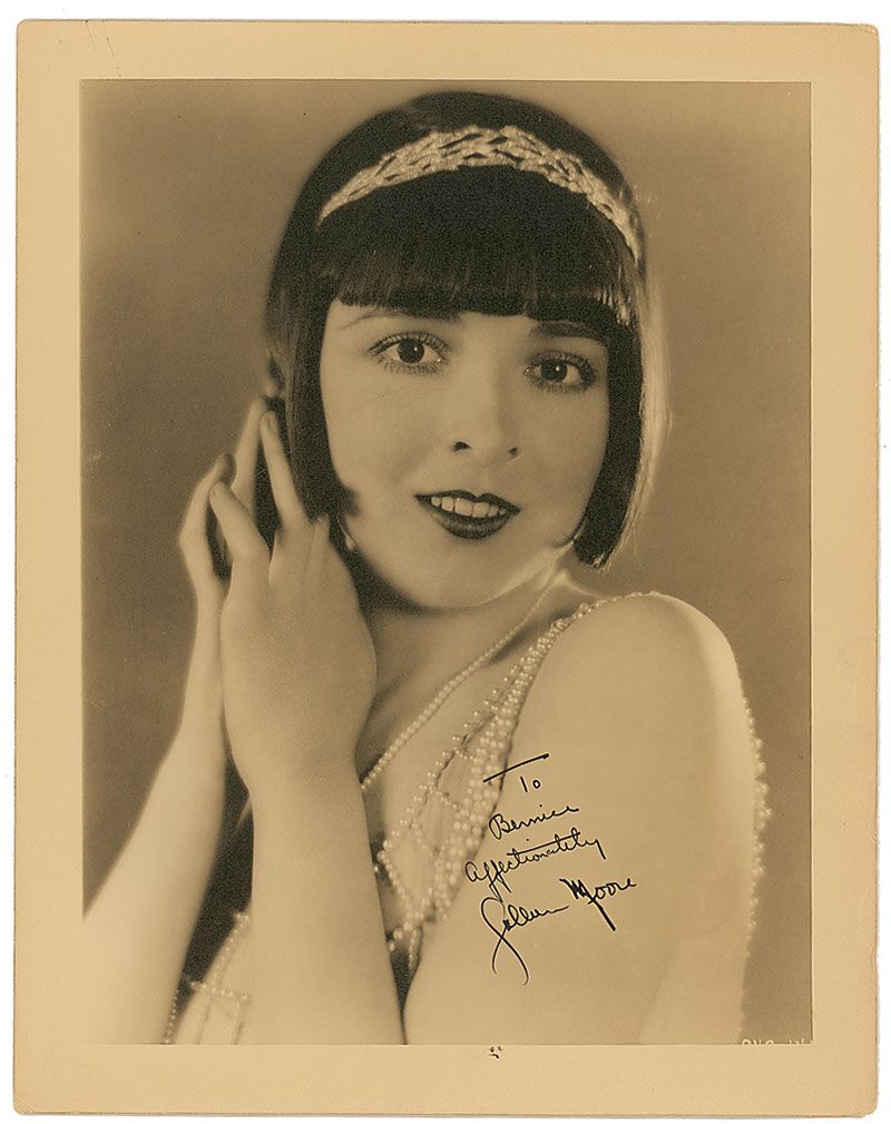 Vintage matte-finish 10.75 x 13.75 photo, signed and inscribed in fountain pen, “To Bernice, Affectionately, Colleen Moore.” In fine condition, with a couple stray ink marks to bottom border. Accompanied by a certificate of authenticity from James Spence.