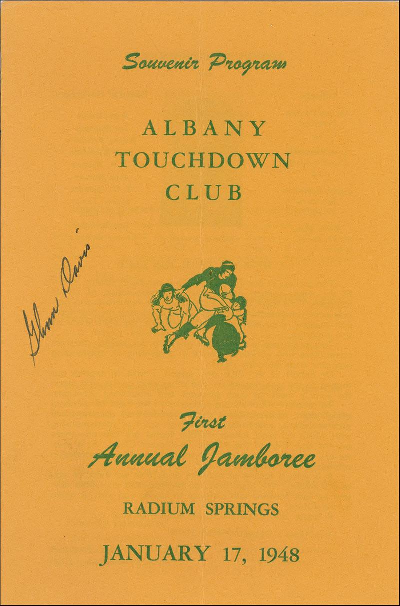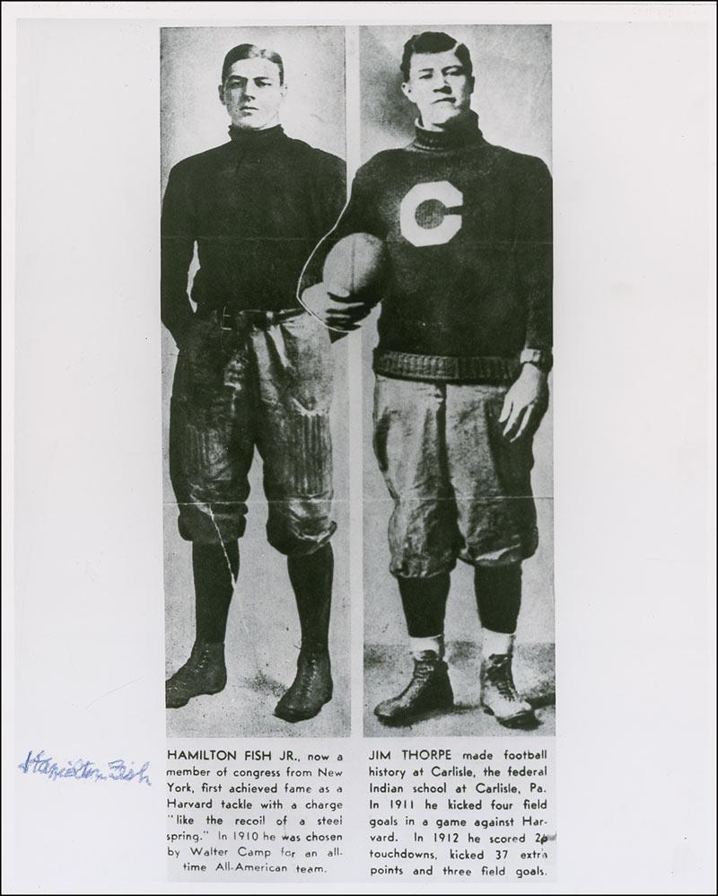 Two items: souvenir program from the Touchdown Club of Albany First Annual Jamboree, 5.5 x 8.25, January 17, 1948, signed in fountain pen on the front cover by Glenn Davis; and a glossy 8 x 10 composite photo of Hamilton Fish III and Jim Thorpe, signed in blue ballpoint by Fish. In very good condition, with central vertical crease to program, and noticeable creases to Fish’s photo, as well as an elderly signature.