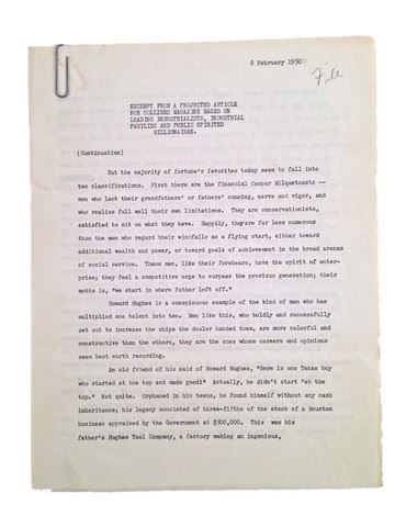 Original excerpt from a projected article for Collier's Magazine with Howard Hughes handwritten revisions dated 8 February 1950 (4 pages total). The excerpt was based on leading industrialists, industrial families and public spirited millionaires. Includes a copy of the letter of provenance which is a letter to a Karen from a writer and Howard Hughes obsessionist named Arelo who gifted her a collection of photos and autographs of Howard Hughes based on her interest in collecting.