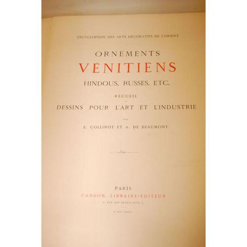 Collinot, E. / De Beaumont, A.. Ornements Venitiens Hindous, Russes, Etc. Recueil De Dessins Pour L'Art et L'Industrie. Paris: Canson, Libraire-Editeur, 1883. Double Elephant - over 25" - 50" tall. Hard Cover. Ex-Library. Good Condition. SCARCE. Half-title, title, 2pp text in French, 2 List of Plates, complete with 40 lithographed plates on hard stock, unbound as issued, in a portfolio. Plates are chromolithographs, duotone, some are hand coloured, some highlighted with gold and silver. LIMITED #458 of 500 issued. DECORATIVE ARTS. Library marks show as ink stamp on back of plates.