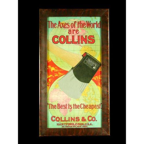 Collins Axe Cardboard String Hanger Sign, Collins and Co. Hartford, Conn. USA. Framed under glass, minor stain at 1:00 otherwise excellent condition. 10 X 20 inches image only.