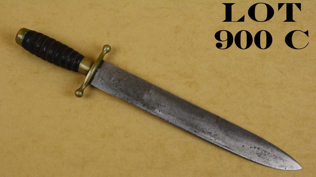 Collins Hospital knife, approx. 16” overall with an approx. 11-1/2” sharpened blade, brass cross guard and pommel cap, grooved wood grip; hilt is marked “LEGITIMUS” and “COLLINS CO., HARTFORD, ACERO FINO, CALIDAD,GARANTIZADA”. This knife is in overall fair condition with some scattered erosion and old cleaning; brass mounts show a nice patina and the wood grip is fair showing wear and some old scattered mars and scratches. Est.: $150-$300.