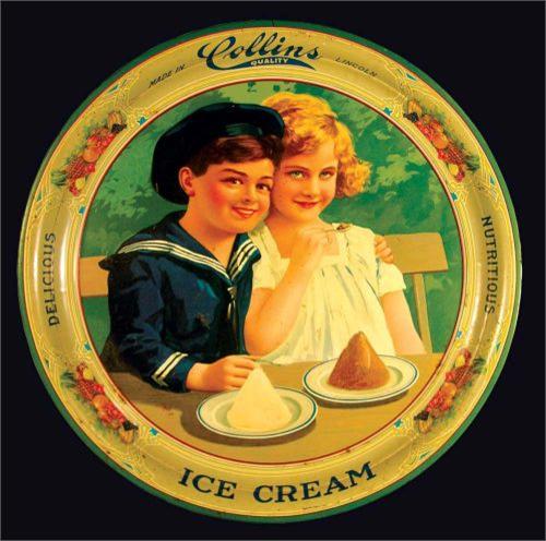 Collins Ice Cream Tin Serving Tray, few minor rust spots otherwise excellent condition 13 1/2 inch diameter.
