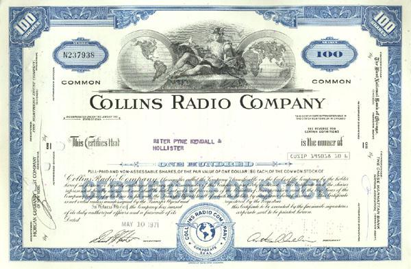 1971, New York. Stock certificate for 100 shares. Blue/White. Engraved vignette of a seated male allegorical figure flanked by two globes. Lightly punch cancelled and Excellent condition.