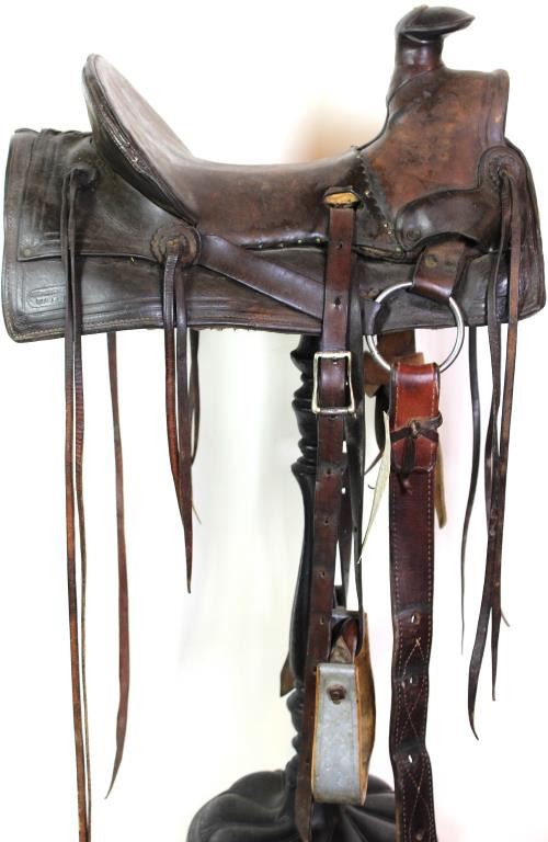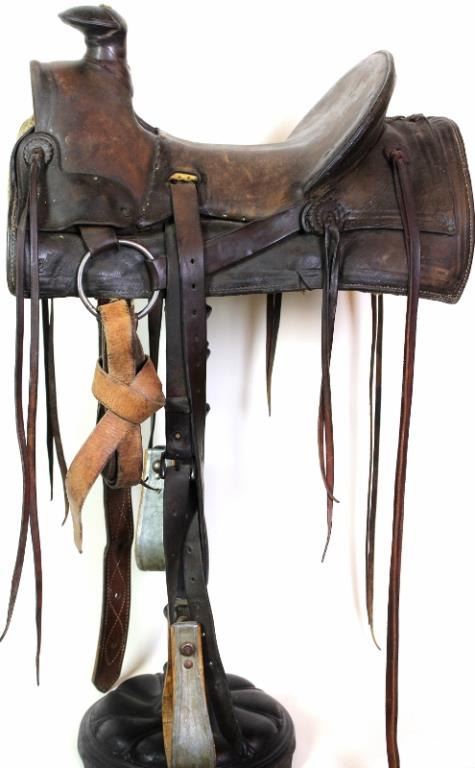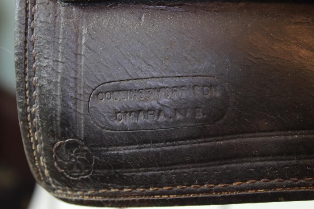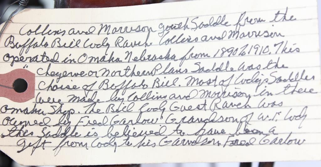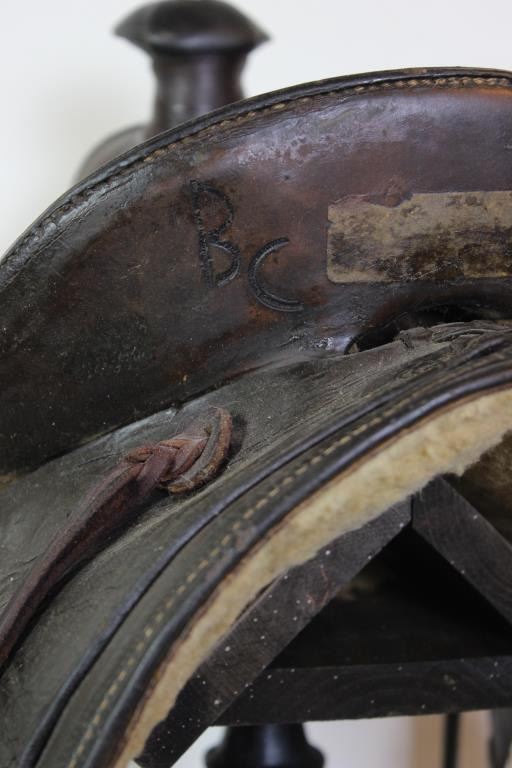 Collins and Morrison youth saddle square skirt, loop seat, from the Buffalo Bill Cody Scout Guest Ranch, back of cantle branded with BC, attached collectors tag stating the saddle was gifted to Fred Garlow Grandson owner of the Guest Ranch by Cody. Est. square skirt, loop seat, from the Buffalo Bill Cody Scout Guest Ranch, back of cantle branded with BC, attached collectors tag stating the saddle was gifted to Fred Garlow Grandson owner of the Guest Ranch by Cody. Est. 450-900