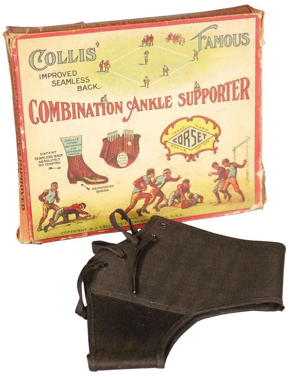 Collis Famous Combination Ankle Supporter, in original box. Copyright 1914, Taunton, Mass. Supporter is unused, box is missing one edge and slightly wrinkled. Box measures 7 X 6 X 7/78 inches. Start Price $40