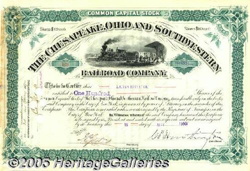 <B>Collis P. Huntington Chesapeake, Ohio & Southwestern Railroad Autographed Stock</B></I> Collis Potter Huntington (1821-1900), railroad magnate, capitalist. Became involved with Leland Stanford, Charles Crocker, and Mark Hopkins (known as "The Big Four"). They financed a survey for the transcontinental route. The Central Pacific was completed to a junction with the Union Pacific in 1869. In 1890 he displaced Stanford as president of the Southern Pacific. He developed the Chesapeake & Ohio. Vindictive and untruthful, he felt railroads should never be burdened with obligations to the public. Gorgeous 1890 railroad stock signed as president. Superb signature barely affected by the cancellation. Includes a nice portrait and biographical information. Minor touch of glue at left border which is common. Still excellent condition. An important stock. <I>Accompanied by COA from PSA/DNA.</B></I>