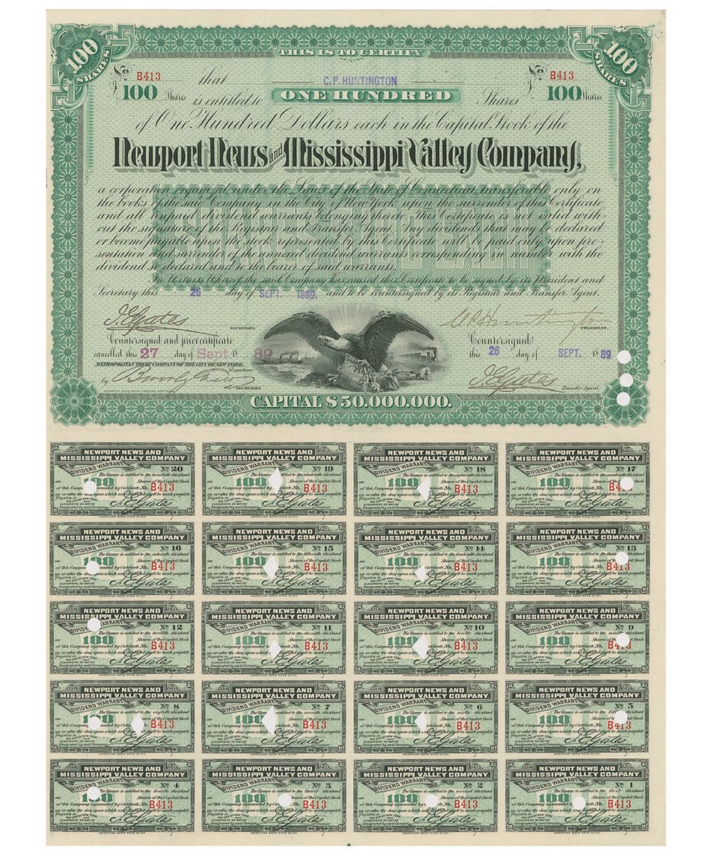 One among scores of gold-seeking “forty-niners,” Huntington eventually became a member of the “Big Four” who organized the Central Pacific Railroad in 1861. Newport News and Mississippi Valley Company stock certificate, No. B413, 11.5 x 15.25, granting 100 shares to Huntington at $50,000,000 capital, signed at the conclusion as president, “C. P. Huntington.” Bottom half of the certificate bears a complete sheet of 20, 100 shares. In fine condition, with a few punch holes to the bottom right corner of the certificate, and some trivial bleeding to the middle initial of the signature.