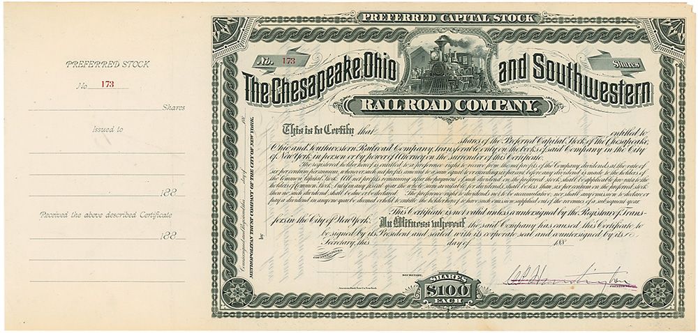 One among scores of gold-seeking ‘forty-niners,’ Huntington eventually became a member of the ‘Big Four’ who organized the Central Pacific Railroad in 1861. DS, signed “C. P. Huntington,” one page, 16.75 x 8, no date. An attractive unissued stock certificate for the Chesapeake, Ohio and Southwestern Railroad Company, signed at the bottom by Huntington as the company’s president. In fine condition, with two purple cancellation lines through signature, some light edge toning, and a vertical fold to left side.