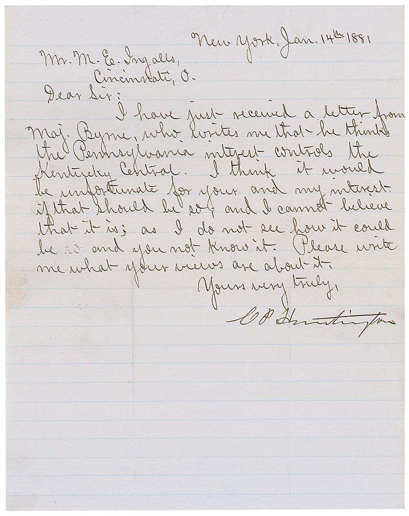 One among scores of gold-seeking ‘forty-niners,’ Huntington eventually became a member of the ‘Big Four’ who organized the Central Pacific Railroad in 1861. LS signed “C. P. Huntington,” one page, lightly-lined, 8 x 10.25, January 14, 1881. Letter to M. E. Ingalls. In part: “I have just received a letter from Maj. Byrne, who writes me that he thinks the Pennsylvania interest controls the Kentucky Central. I think it would be unfortunate for your and my interest if that should be so; and I cannot believe that it is; and I do not see how it could be so.” In fine condition, with intersecting folds, one through a single letter of signature.
