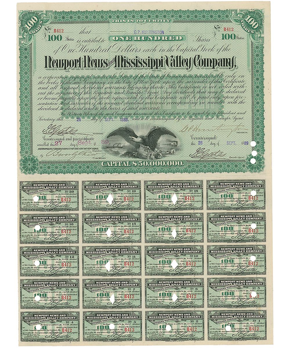 DS, signed “C. P. Huntington,” one page, 11.5 x 15.5, September 26, 1889. Attractive stock certificate for 100 shares of the Newport News and Mississippi Valley Company, signed at the bottom by Huntington as the company’s president. Bottom half of the certificate bears a complete sheet of 20 coupons. In fine condition, with expected document wear and cancellation holes to the lower right corner and all coupons.