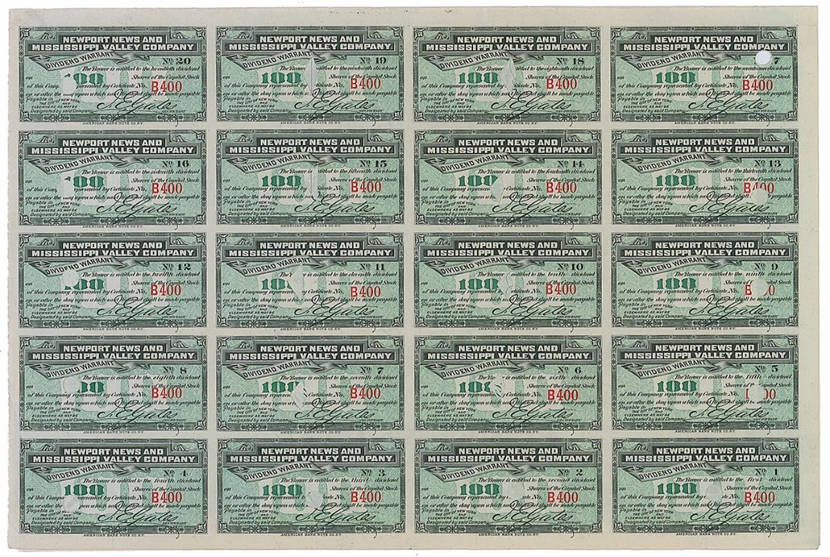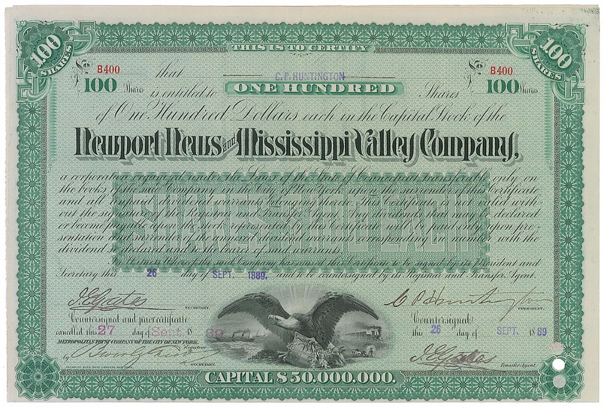 Partly-printed DS, signed “C. P. Huntington,” one page, 11.5 x 15.5, September 26, 1889. Stock certificate issued to Huntington for 100 shares of capital stock in the Newport News and Mississippi Valley Company. Signed at the conclusion by Huntington as the company’s president and countersigned twice by the secretary, J. E. Gates. Retains twenty canceled but intact dividend coupons below. In fine condition, with expected document wear and brushing to one of the countersignatures.