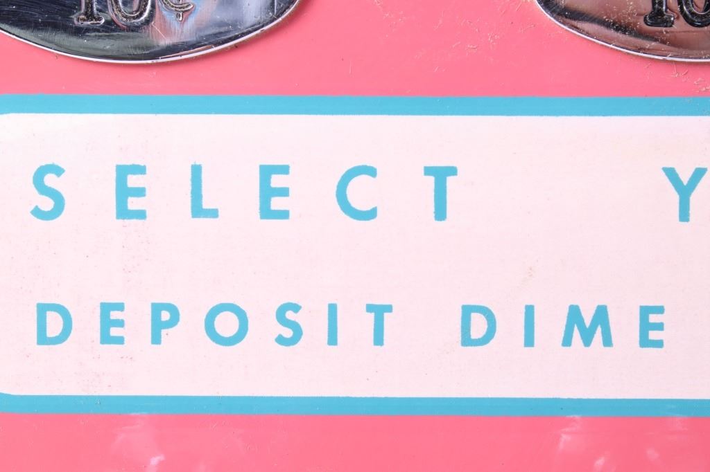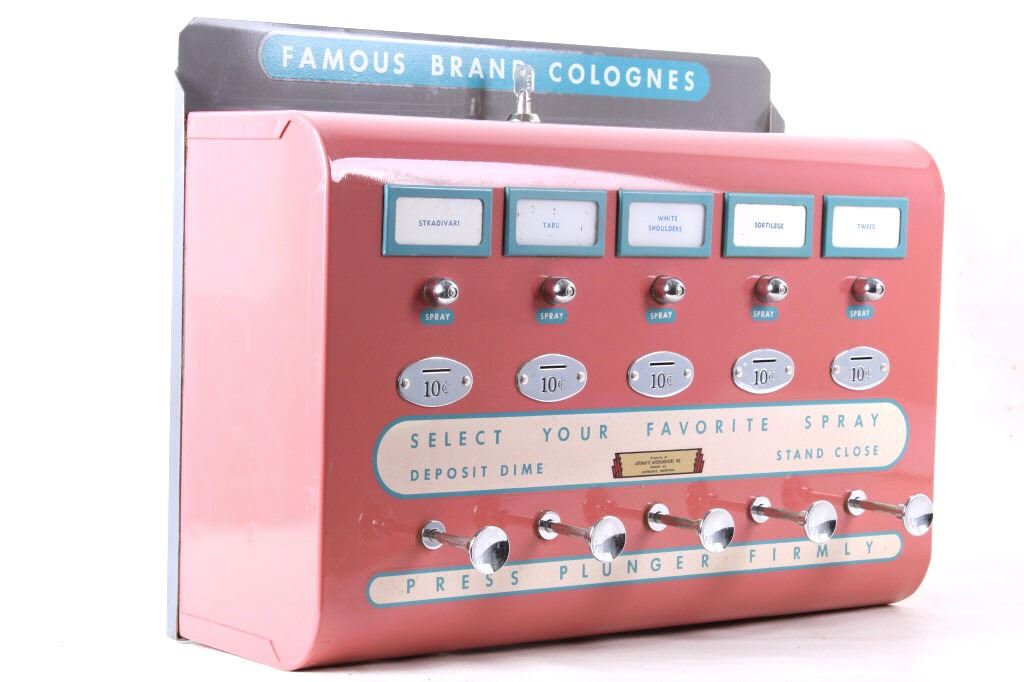 For your consideration is this ORIGINAL Colma Model A-53 Coin Op. Spray Cologne Dispenser in its ORIGINAL packaging. This dispenser originally made for Automatic Merchandisers Inc. Sunburst, Mt. This dispenser is from the mid 1900's and as advertised on the machine takes a dime as payment for a spray of the desired Famous Brand Colognes cologne. This item comes complete with a large variety of tags for brand name choices and the key that allows for refill and exchange of those choices. This coin-operated machine shows a bright friendly color that was so common mid century. This piece of equipment comes with installation instructions and information regarding usage. The measurements of this dispenser are 14 1/2" x 18" x 9".