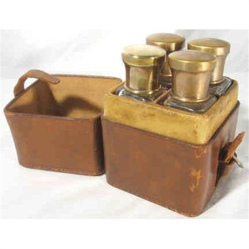 A Victorian leather case containing four crystal bottles each with its origuinal glass stopper. Each bottle has a brass "collar" and screw top. There is no damage of any kind to the bottles. The leather carrying case shows wear around the buckle part, there are no splits just "rubbing" wear. The leather case needs "feeding" and cleaning. It is marked"foreign made" as was a lot of merchandise sent to England in the late 1800's. Used for a variety of colognes? Each bottle stands 3.1/2" tall and is 1.1/8" square. Many more pictures are available, please ask. For the man who has everything!!