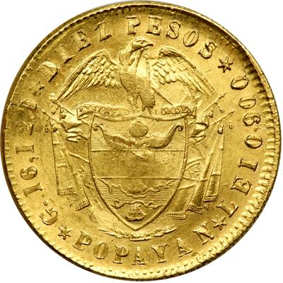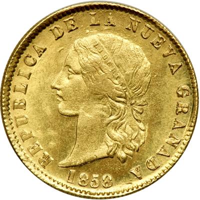 Colombia. 10 Pesos, 1858 (Popayan). Fr-86; KM-129.2. Granadine Confederation. Diademed head of Liberty left. Reverse: Bannered arms surmounted by Condor; value, fineness, and mint. Well struck up, with very lustrous fields. Very nice for issue and thus Rare. NGC graded MS-64.