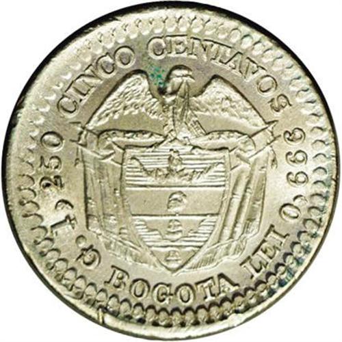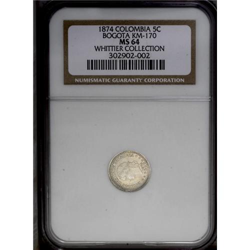 <B>Colombia 5 Centavos 1874 Bogota, </B></I>KM170, MS64 NGC, incredibly sharply struck with full mint brilliance and just a hint of golden toning. Very rare and desirable grade for this type.
