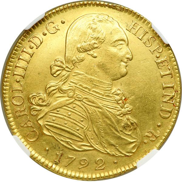 Colombia. 8 Escudos, 1792-JF (Popayan). Fr-52; KM-62.2. Charles IV. Official uniformed bust right. Reverse: Crowned Hapsburg arms within chain of the Order of the Golden Fleece. Surface hairlines. NGC graded Uncirculated, Details.
