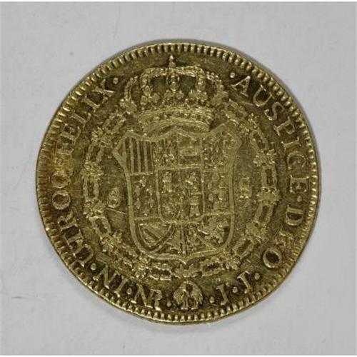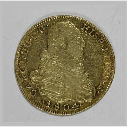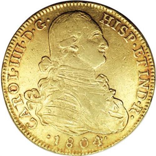 <B>Carlos IIII gold 8 Escudos 1804/3-JJ Nuevo Reino,</B></I> KM62.1, lightly toned XF, some tiny surface marks, well-struck with no adjustment marks and the overdate is very easy to see.<BR><BR><b>Shipping:</b> Coins & Currency (<a target="_blank" href="http://www.heritageauctions.com/common/shipping.php">view shipping information</a>)