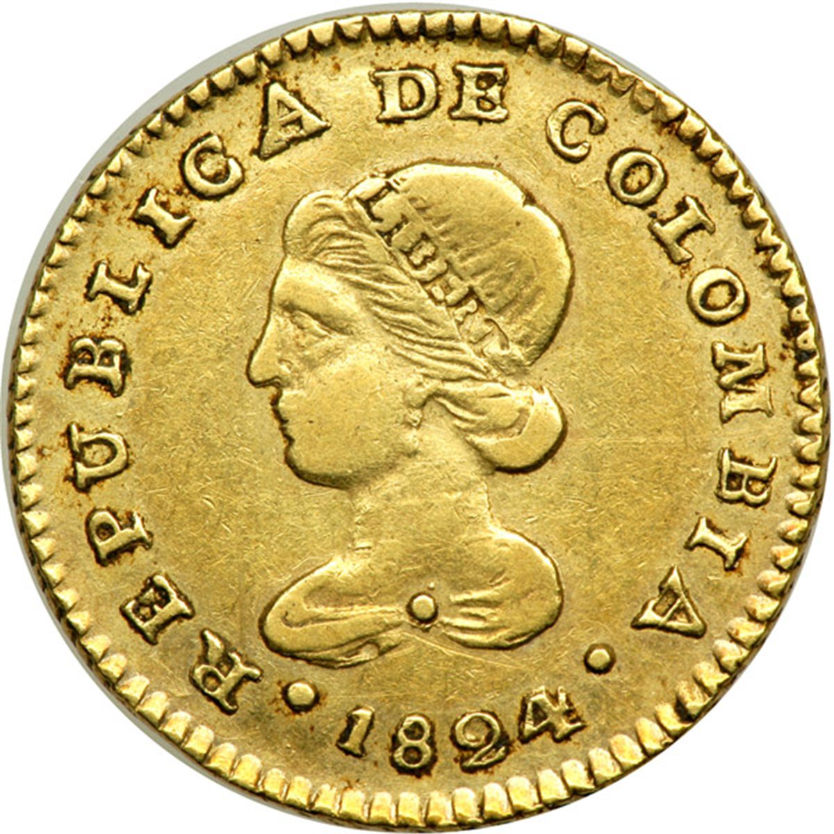 Colombia. Escudo, 1824-FM (Popayan). Fr-72; KM-81.2. Weight 0.0952 ounce. Head left. Reverse: Fasces between cornucopias. Very Fine.