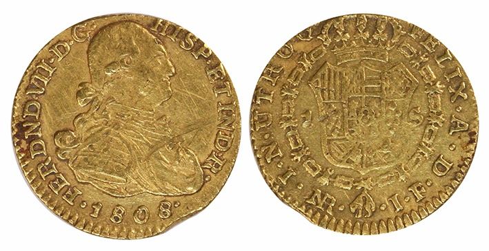 Colombia, Ferdinand VII, Gold Escudo, Neuvo Reino Mint, 1808-NR-JF, (KM.64.1) slightly clipped to edge, else grade as very fine