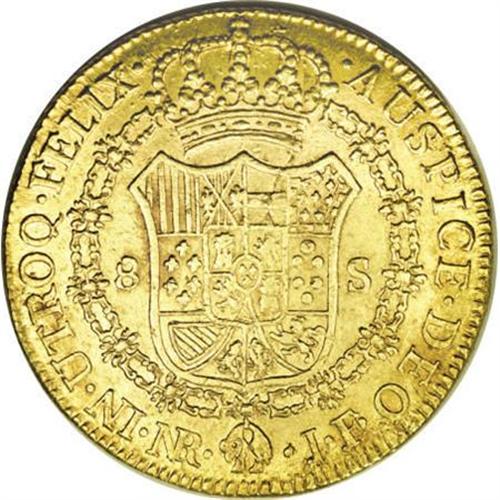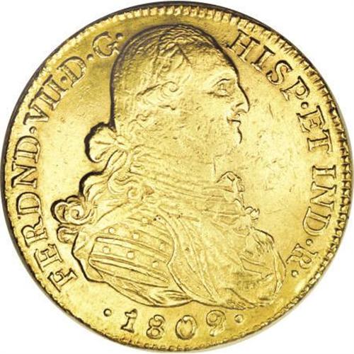<B>Ferdinand VII gold 8 Escudos 1809/8NR-JF,</B></I> KM66.1, lustrous XF-AU, well-struck on a problem-free flan, lightly cleaned at one time with scattered small surface marks on the obverse and one rim bruise. The overdate is very clear.<BR><BR><b>Shipping:</b> Coins & Currency (<a target="_blank" href="http://www.heritageauctions.com/common/shipping.php">view shipping information</a>)