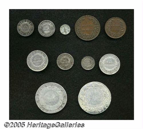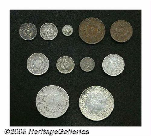 <B>Nueva Granada Type Collection, </B></I>eleven coins comprising: KM101 1/2 Decimo 1847, nice brown XF, KM102 Decimo 1847, F-VF, KM108.1 1/4 Real 1850B, nice AVF and scarce, KM112 Real 1852B - two pieces - AVF/F and VF+ polished, KM109 2 Reales 1851B, F-VF, KM114 1/2 Decimo 1857B, toned VF, KM115 Decimo 1856B, VF+, planchet flaw reverse, KM117 2 Decimos 1855B, nice Fine, KM106 8 Reales 1847B, VG-F, planchet laminations, and KM107 10 Reales 1848, AVF but weakly struck central details on both sides. <B>Sold as is, no return lot.</B></I>