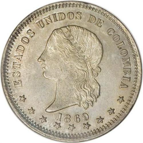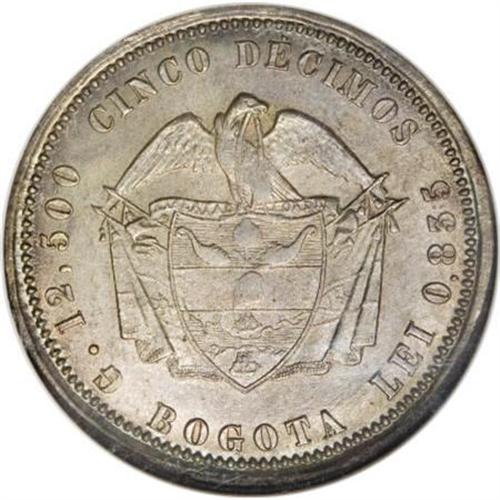 <B>Republic-Estados Unidos 5 Decimos 1869-Bogota, </B></I> KM153.1, MS64 NGC Whittier Collection, lovely pewter gray and gold patina over lustrous fields and exceptionally well-defined details. A coin with immediate eye appeal. Very rare quality.<BR><BR><b>Shipping:</b> Coins & Currency (<a target="_blank" href="http://www.heritageauctions.com/common/shipping.php">view shipping information</a>)