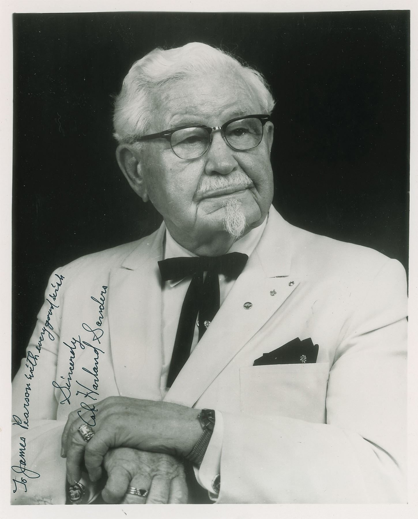 Appealing glossy 8 x 10 bust-length photo of Sanders wearing his patented white suit and leaning on one of his custom canes, signed and inscribed in black ink, "To James Pearson with every good wish, Sincerely, Col. Harland Sanders.” In fine condition.
