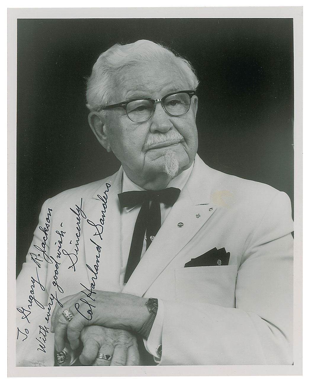 Glossy 8 x 10 photo of the KFC founder in his trademark white suit, signed and inscribed in black felt tip, "To Gregory R. Jackson, With every good wish, Sincerely, Col. Harland Sanders.” In very good condition, with a paperclip impression to the top edge, roughness to the emulsion passing through Sanders's face, and a stain near his lapel. Accompanied by a full letter of authenticity from JSA.