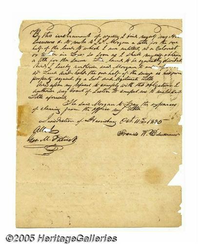<B>Colonel James Morgan 1835 Texas Land Document</B></I> A manuscript document dated October 11, 1835 at Harrisburg, Pennsylvania in which Francis W. Delesdernier quitclaims to James Morgan <I>"a title for the one half-of-the-land to which I am entitled as a colonist or settler in Texas as soon as I shall myself obtain a title for same..."</B></I> This document is dated in the same year that Morgan obtained a twenty year old mulatto woman named Emily West in New York to be an "indentured servant" on his settlement in Texas. This very Emily is best known as the "Yellow Rose of Texas" because, as the story goes, she was helping to load a flatboat when Santa Anna's army arrived. Emily was captured and, being very attractive, was made a personal "servant" of Santa Anna. The decisive Battle of San Jacinto was probably lost by the Mexicans owing to the fact that Emily was closeted in his tent at 4:30 p.m., April 21, 1836, at the time the cry went up: <I>"The enemy! They come! They come!"</B></I> Santa Anna was caught with his pants down (literally) and order could not readily be restored. General Sam Houston's Texian army won the day, and Texas' Independence. Today, the heroic acts of the young slave woman from New York are still respectfully commemorated by the members of the Knights of the Yellow Rose of Texas each spring at San Jacinto. Morgan's Point, Texas was named for Colonel Morgan. Not signed by Morgan and in only fair condition, a bit tattered and separating at folds but still very desirable. A great association item. Lot:253