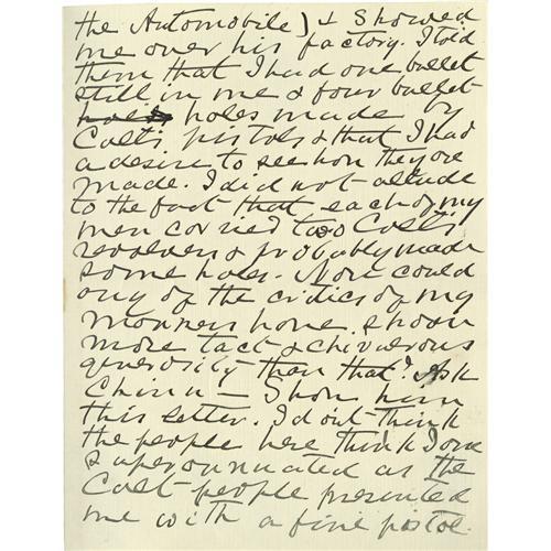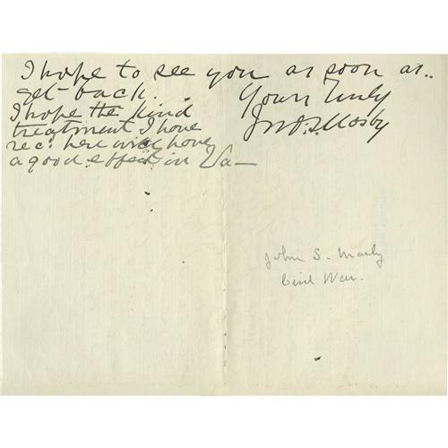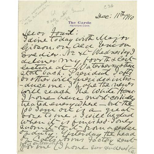 <B>Colonel John S. Mosby Autograph Letter Signed</B></I> "<I>Jno. S. Mosby.</B></I>" Three pages, 5.25" x 6.75", The Garde, Hartford, Connecticut, December 11, 1910. The content discusses his lecture tour, his cordial reception everywhere, and it reads in part, "<I>…Yesterday the head of Colt's Arms Factory sent his automobile for me (I have surrendered to the Automobile) & showed me over his factory. I told them that I had one bullet still in me & four bullet holes made by Colts pistols & that I had a desire to see how they are made…</B></I>" John S. Mosby was a noted Cavalry leader in the Confederate Army, he was known as the "Grey Ghost" because of his ability to disappear and hide from Union troops along with his men. The letter is in very fine condition; usual folds are present; pencil notations present on page 1,2 and 4. From the Henry E. Luhrs Collection. Accompanied by LOA from PSA/DNA.