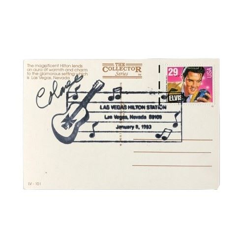 Las Vegas Hilton Hotel original, hand signed postcard from Colonel Tom Parker (1909-1997) who was the manager of Elvis Presley from 1955 to the day he died in 1977. This comes direct from the collection of Aaron Presley Jr. and was given to him directly from the Colonel. This is the first time anything from his collection has been made available to the public.
