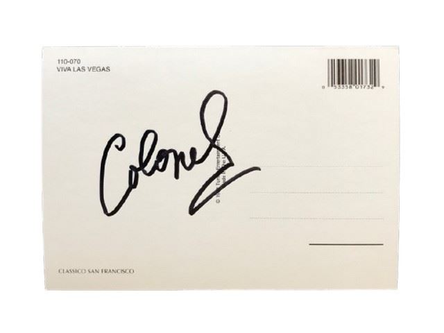 Viva Las Vegas original, hand signed postcard from Colonel Tom Parker (1909-1997) who was the manager of Elvis Presley from 1955 to the day he died in 1977. This comes direct from the collection of Aaron Presley Jr. and was given to him directly from the Colonel. This is the first time anything from his collection has been made available to the public.
