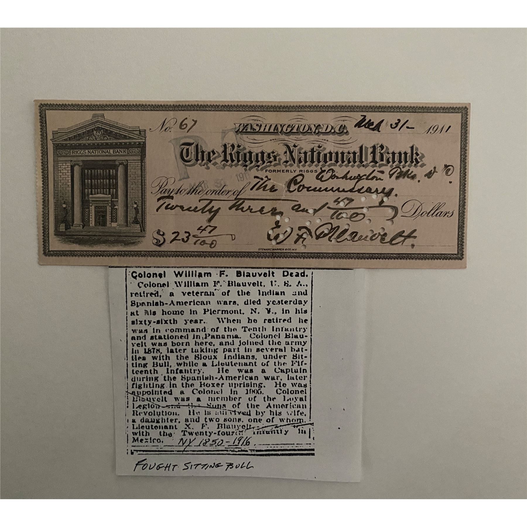Colonel William Francis Blauvelt signed check and obituary. The Colonel was famous for fighting Sitting Bull. Check dated 1911 8x7 inches