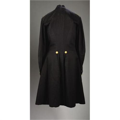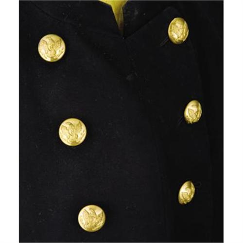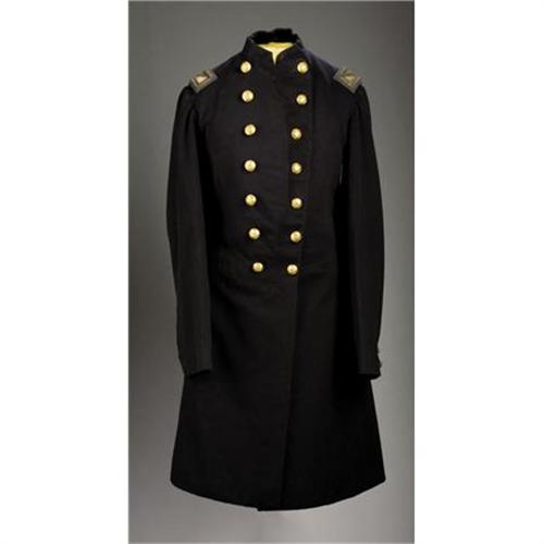 <B>COLONEL OF CAVALRY CIVIL WAR OFFICER'S FROCK COAT OF COLONEL (BVT. BRIG. GEN.) HORACE CAPRON OF THE 14TH ILLINOIS CAVALRY.</B></I> Exquisite quality blue wool with black silk lining. Quilted in the upper body, draped skirt, Great period sleeve cut (10” elbows tapering to 5” cuffs, raw cut skirt edge). White polished cotton sleeve linings, brown polished cotton breast pocket lining. 1¼” high black velvet lined stand up collar. Double breasted seven-button front with all the original D. Evans eagle Cs. Two original Evans eagle Cs on top of rear pleats, two on the bottom of the pleats missing. Split cuffs with three-button closure. All cuff eagle C cuff buttons with period Scovill backmark. Original, massive colonel of cavalry shoulder straps. 2¼” wide with very heavy triple bullion border and gilt wire borders, bullion eagle with sequins on the wings, yellow velvet background. Just some wear to the velvet background otherwise about perfect and unquestionably original to the coat.<BR><BR>Capron was commissioned lieutenant colonel on December 13, 1862, and joined the 14th Illinois cavalry with its formation of January 7, 1863. He was appointed colonel on the 6th of February 1863 and served as the regimental and, subsequently, first cavalry brigade Army of the Ohio commander until his resignation in February 1865 due to injuries suffered in a fall from his horse. Capron was commissioned brigadier general on orders from the war Department dating to March 13, 1865. Capron had a colorful history and three of his sons also served in the Union Army, one of whom was killed in action and awarded the Congressional Medal of Honor. Included with the extensive research material accompanying the coat is the correspondence concerning accusations (which eventually came to naught) that Capron had expropriated for personal use some $12,000 worth of captured livestock from the raids he led, a colorful history indeed. The 14th Illinois cavalry saw extensive service in Kentucky, Tennessee, and the Atlanta campaign., as well as action against Thompson’s Legion of Whites and Cherokees in north Carolina (where his son was killed), from March 1863 until its muster out on July 31, 1865, losing two officers and 23 enlisted men killed and mortally wounded and 190 enlisted men to disease. A beautiful Civil War cavalry officer’s frock coat with a wonderful history.<BR><BR><B>Condition:</B></I> Superb condition, just showing minor wear on the velvet collar lining and the slightest fading to the black silk lining. Just some minor scattered spots of mothing of the knap, and a few tiny holes on the skirt, really negligible. <BR><BR><b>Shipping:</b> Clothing, Costumes & Jerseys (<a target="_blank" href="http://www.heritageauctions.com/common/shipping.php">view shipping information</a>)