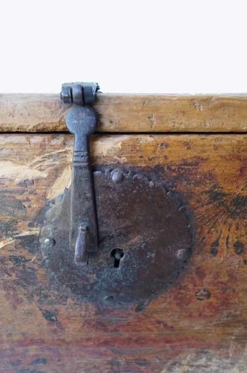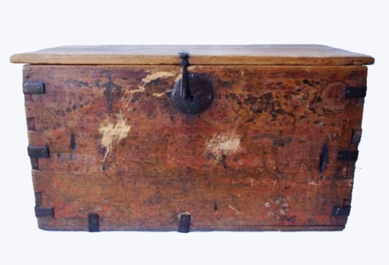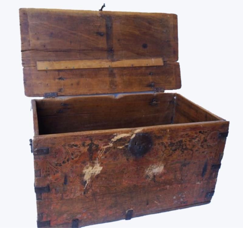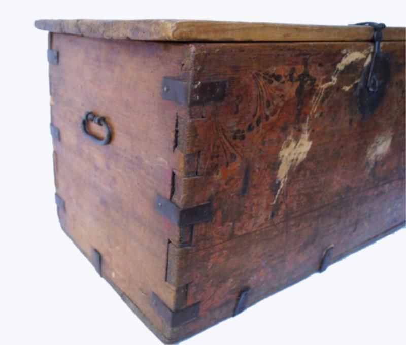 Colonial American Western chest. Front decorated with horse and riders, flowers. Dove-tail heart pine construction 34 1/2" x 17 1/2 " x 18 1/2". Braced with iron angles on every edge and corner as well as blacksmith forged lock.