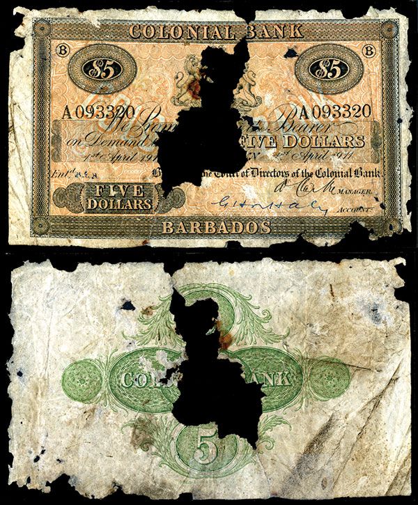 Bridgetown, Barbados, 1st April, 1911, $5, P-S141, Issued banknote, Black on light reddish-brown underprint, Arms in middle but almost totally obliterated due to large hole in center, S/N A093320, The note would have been in Good to VG condition with edge faults, but there is a large 3 by 1.5 inch hole in the middle. Extremely rare note in any form and unpriced in SCWPM. This space filler may be very difficult to improve upon. P&B.