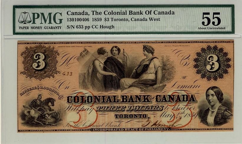 Colonial Bank of Canada, 1859 $3 #633, CH-130-10-04-06, PMG AU55