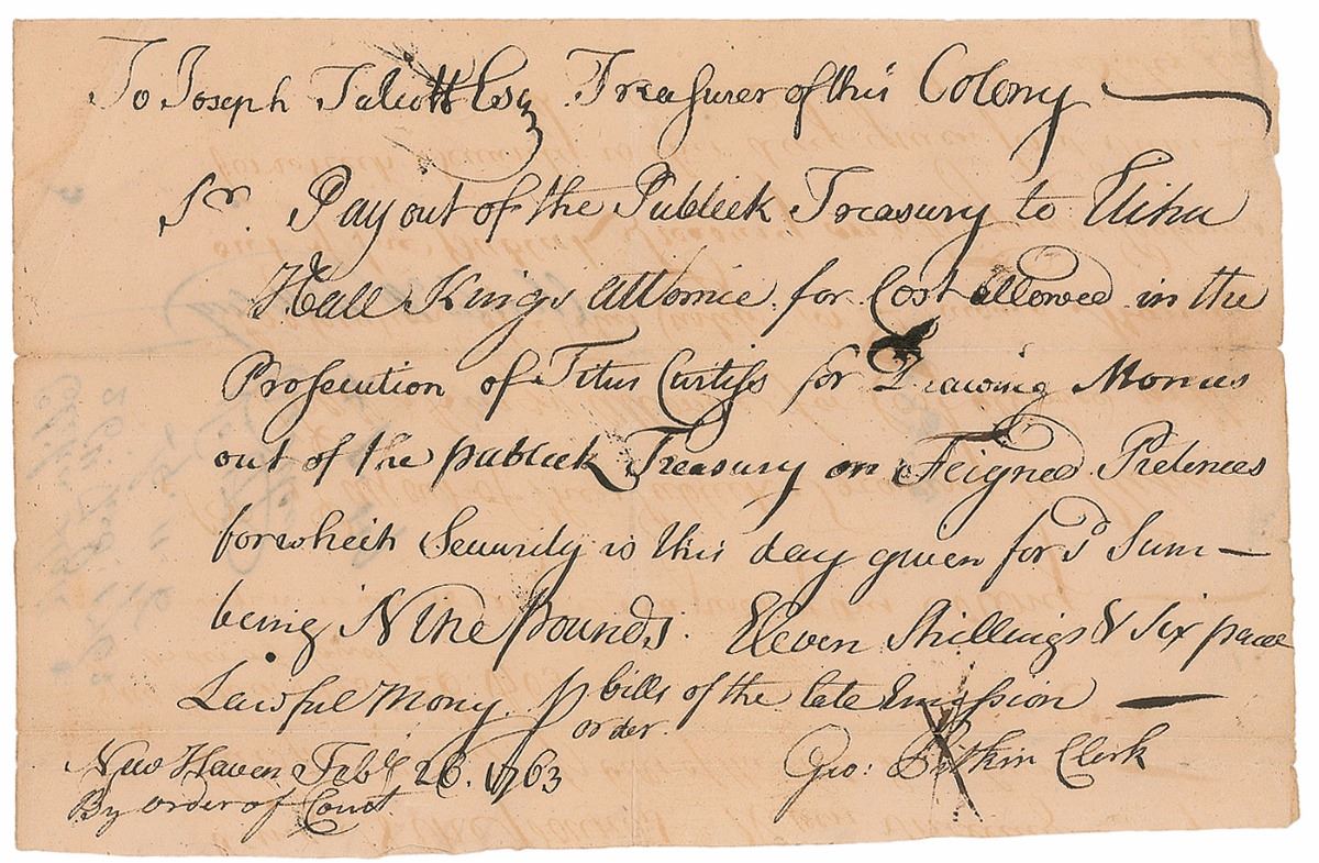 Manuscript DS, signed “Geo. Pitkin,” one page, 7.25 x 4.75, February 26, 1763. Document issued to pay for the prosecution of a man accused of fraud. In part: “Pay out of the Publick Treasury to Elisha Hall Kings Attornie for cost allowed in the prosecution of Titus Curtiss for drawing monies out of the public Treasury on Feigned Pretences.” Expected document wear, light mirrored ink from a page no longer present, and a cancellation notation through the signature, otherwise fine condition.