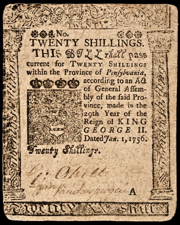 Colonial Currency, 1756 BENJAMIN FRANKLIN Printed Pennsylvania, 20s Note