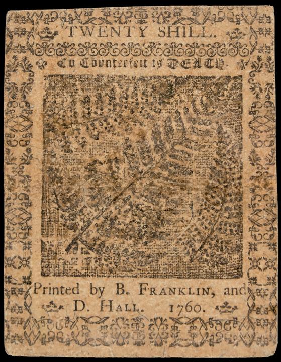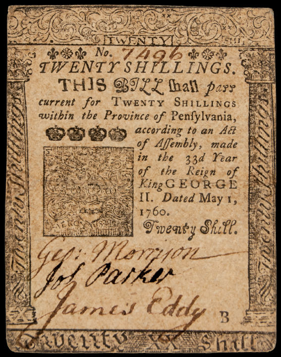 Colonial Currency, 1760 B. Franklin Printed, PA