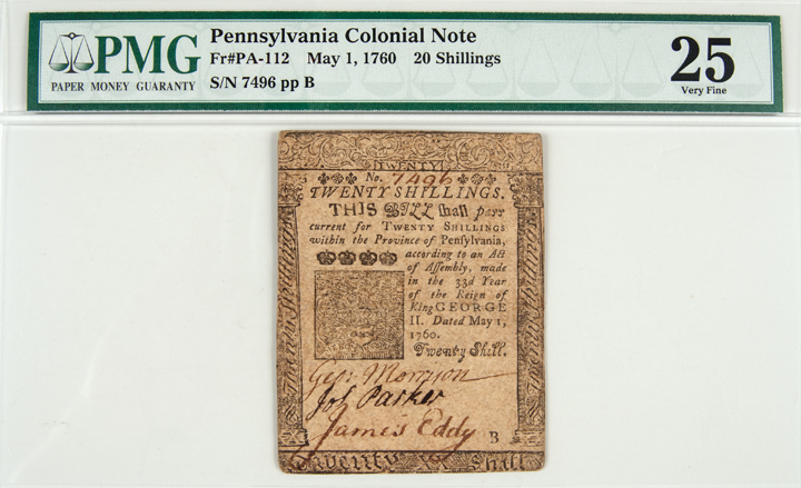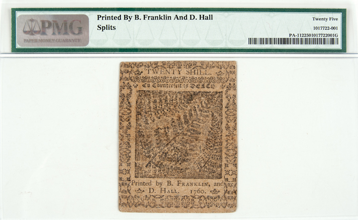 Province of Pennsylvania. May 1, 1760. 20 Shillings. Plate B. “Printed by B. Franklin” Issue. Splits. PMG graded Very Fine-25.