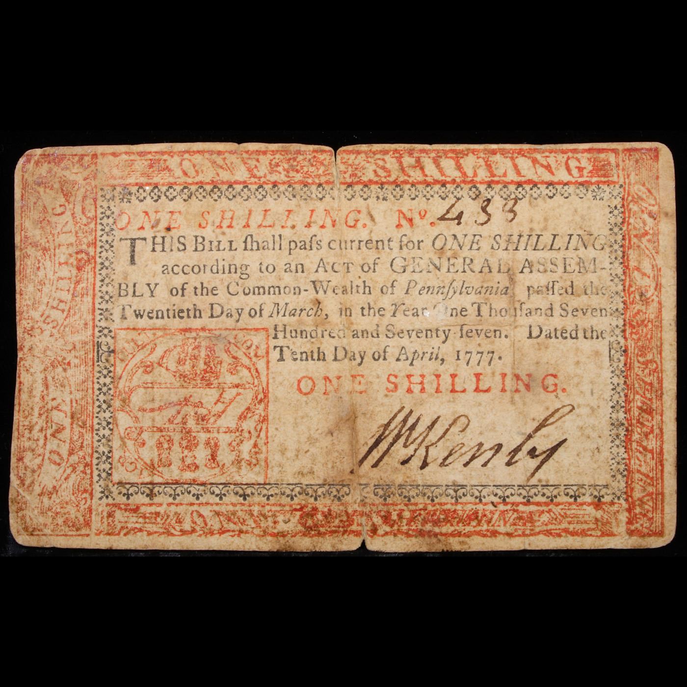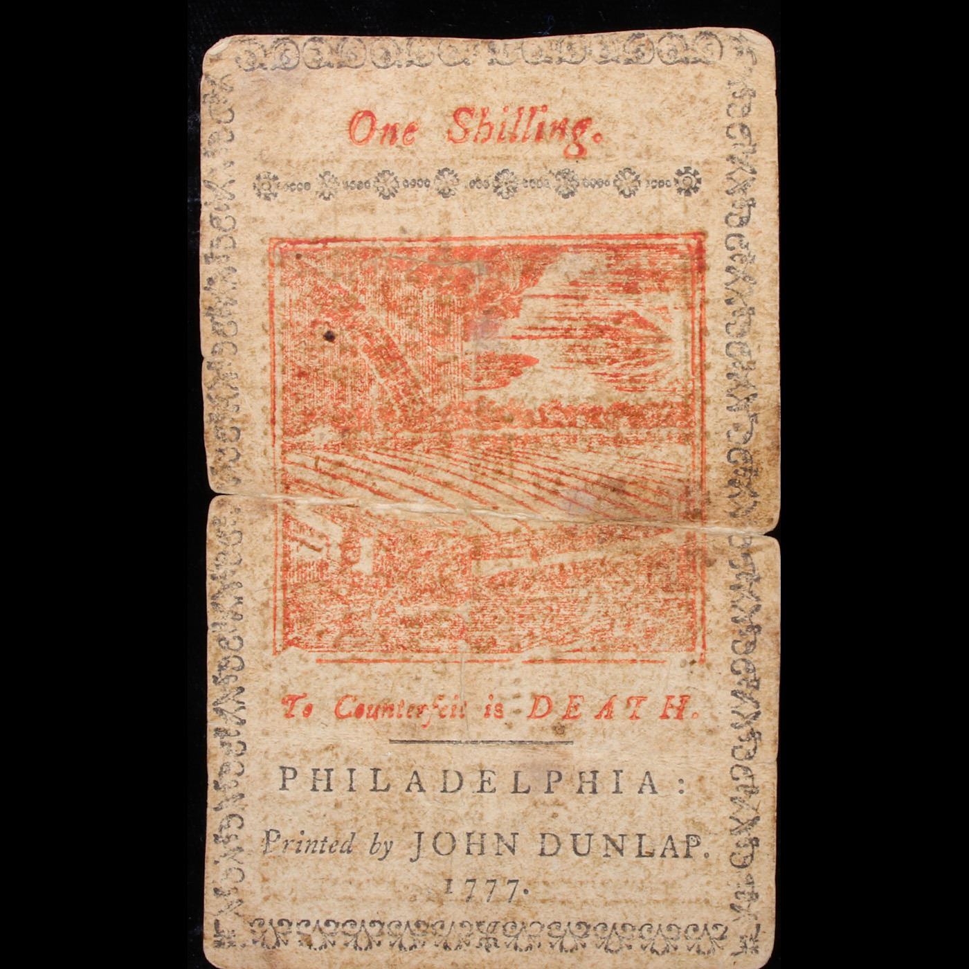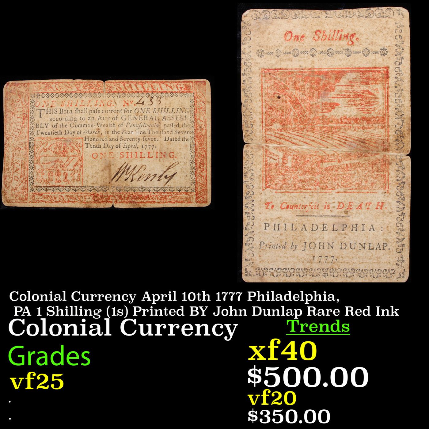 Colonial Currency April 10th 1777 Philadelphia, PA 1 Shilling (1s) Printed BY John Dunlap Rare Red Ink Grades vf+. John Dunlap was an Irish printer who printed the first copies of the United States Declaration of Independence and was one of the most successful Irish/American printers of his era