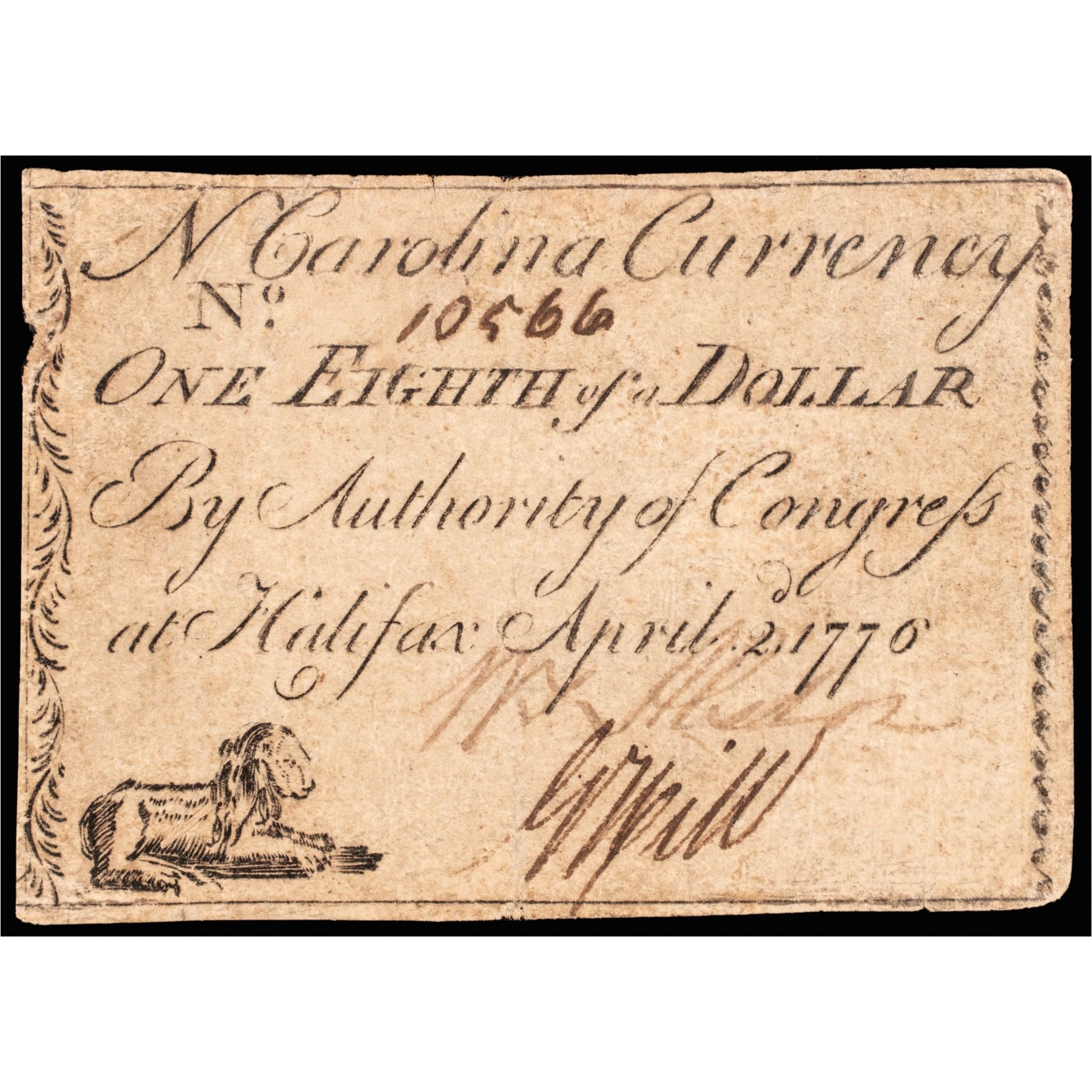 North Carolina Currency, April 2, 1776 Halifax Issue, One Eighth of a Dollar, “Lion” vignette, PCGS graded Very Fine-25.