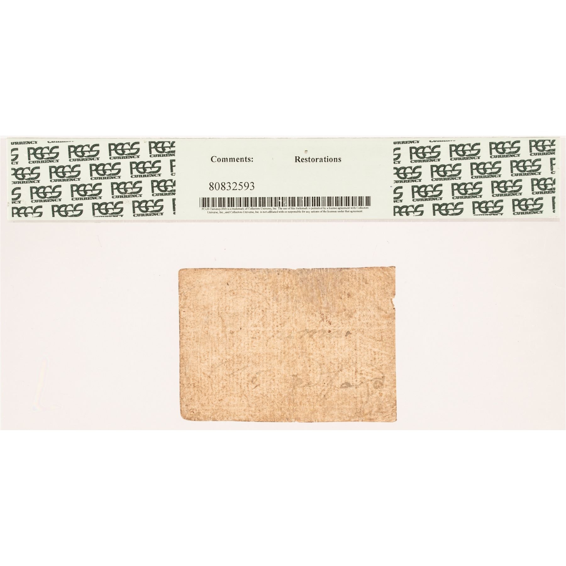 Fr. NC-154c. A clean pleasing quality note that is well centered on this 1776 Revolutionary War issue note. It displays a sharply detailed “Lion” vignette at lower left. Its PCGS holder states restorations apparently for a sealed edge split at the upper right margin. Both signatures are clearly readable, with the blank reverse side particularly clean. A superior example of this scarce “Lion” vignette note on this extremely popular North Carolina currency issue. Collectors lacking this major vignette type should strongly consider this nice note.