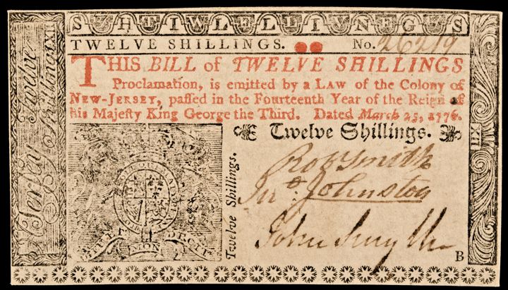 Colonial Currency, Ch. Uncirculated March 25, 1776 New Jersey Twelve Shillings