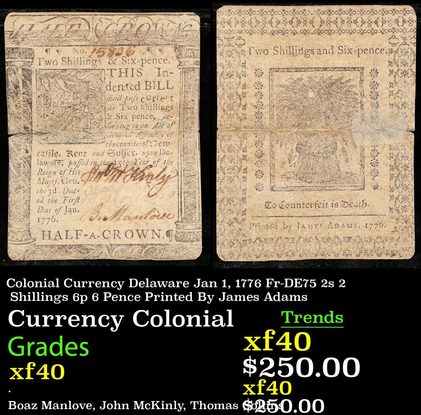 Colonial Currency Delaware Jan 1, 1776 Fr-DE75 2s 2 Shillings 6p 6 Pence Printed By James Adams Grades xf. John McKinly, Thomas Collins, and Boaz Manlove were the signers of this piece. Only 12,000 of these notes were printed. The printer, James Adams, also engraved the cuts for this issue. Irish-born Adams printed the Delaware issues from 1760-77 and until 1775 he was the only printer who settled in Delaware. For seven years prior, he worked in Philadelphia for Benjamin Franklin & David Hall.