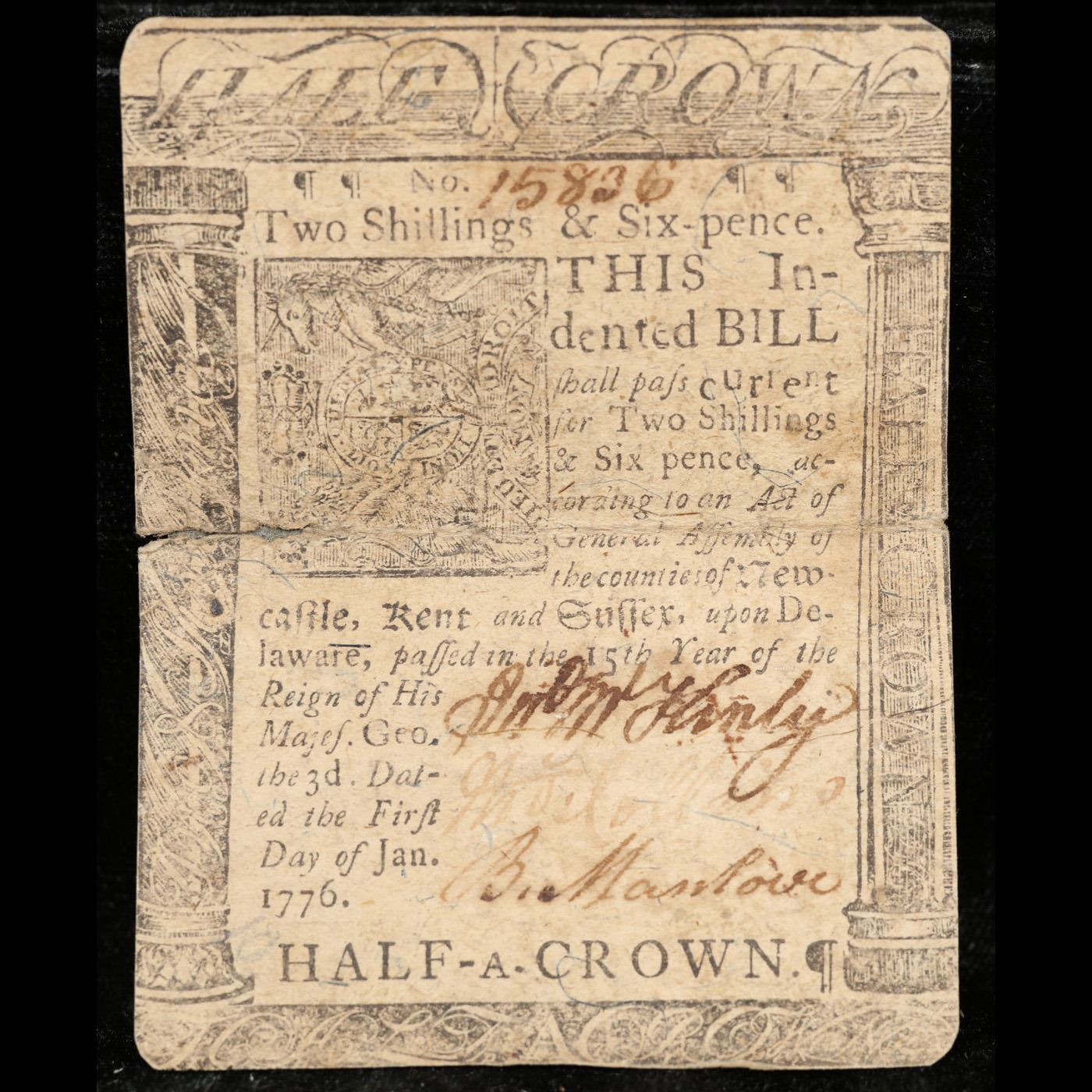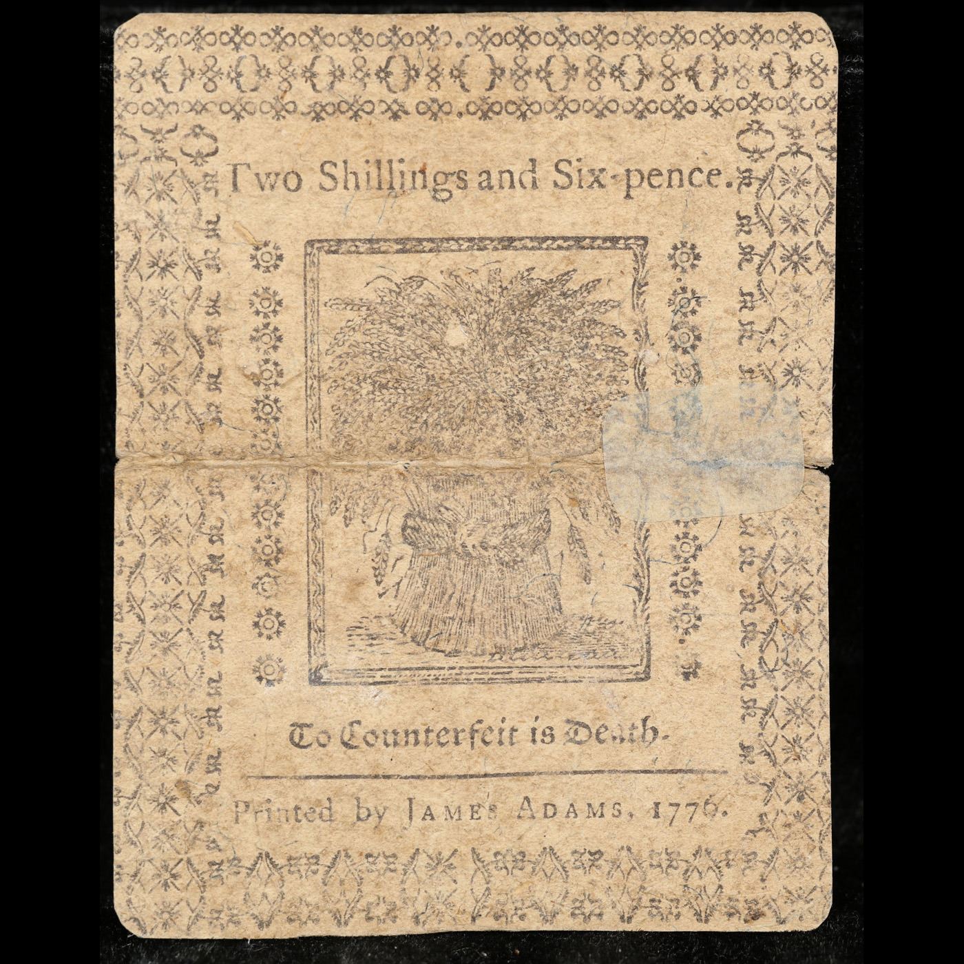 Colonial Currency Delaware Jan 1, 1776 Fr-DE75 2s 2 Shillings 6p 6 Pence Printed By James Adams Grad
