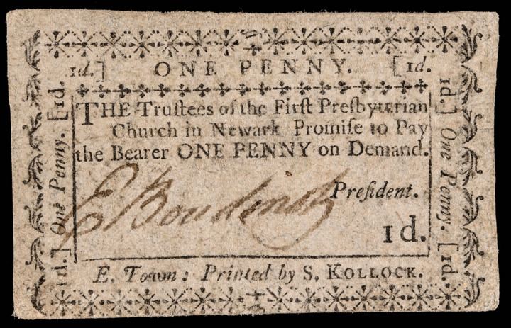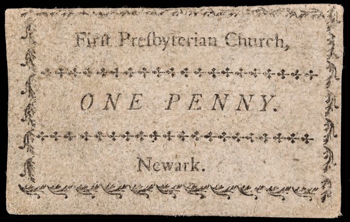 New Jersey. First Presbyterian Church at Newark. December 16, 1790 Issue. ONE PENNY denomination. Extremely Fine. This well printed and nicely centered, typeset small change private issue Church Money note is typeset at bottom: “E. Town: Printed by S. Kollock.” This denomination has the text “One Penny” on both left and right, whereas the date is typically seen printed along the right side. It has all of its border designs distinct and present with the text clearly readable. The signature of “E. Boudinot” as President is large and beautifully written in brown ink, having one of the finest examples of his signature we have seen. Likely less than two dozen or so known to exist and not listed with a value in Newman due to its rarity. Near impossible to locate in high quality and is an important, historic American rarity.